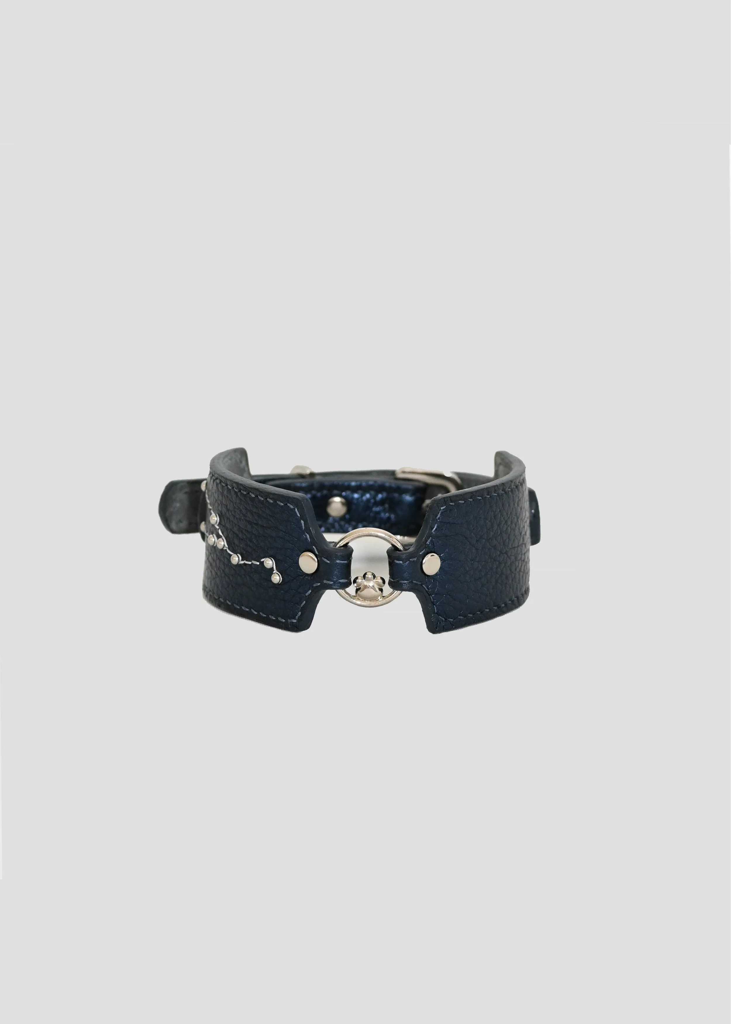 12 constellations are embroidered in silver on deep navy shimmer leather.